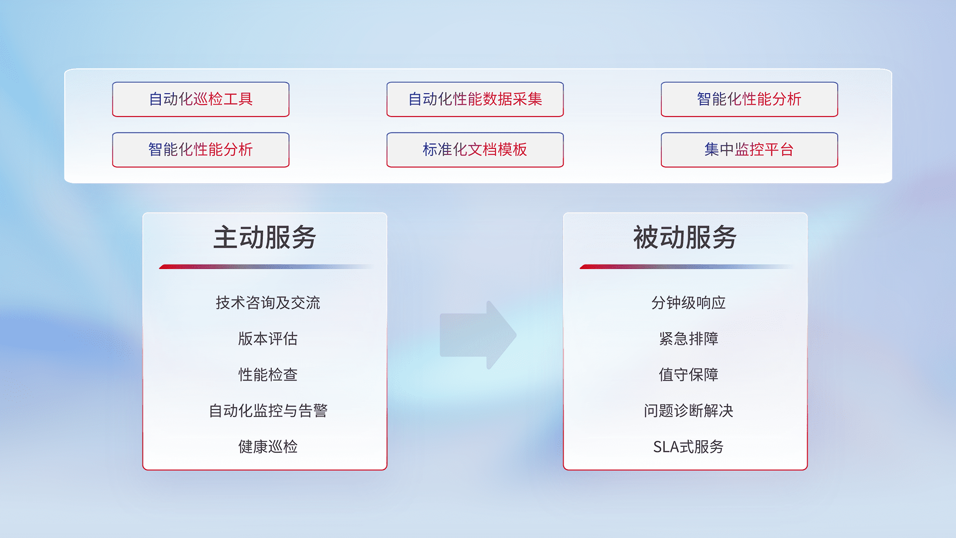 智能化工具和标准化文档,,,,保障服务质量,,,,提供主动服务(包含技术咨询、、版本评估、、性能检查、、自动化监控与告警、、、健康巡检)和被动服务包含(分钟级响应、、、、紧急排障、、、值守保障、、、、问题诊断解决、、、、SLA服务)。。。。